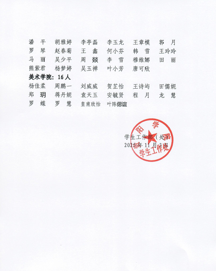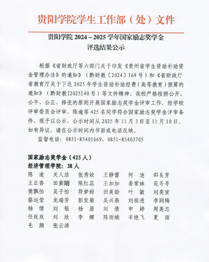 贵阳学院2024-2025学年国家励志奖学金评选结果公示