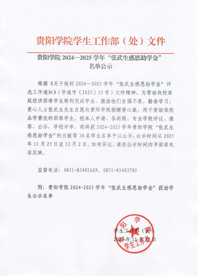 贵阳学院2024—2025学年“张武生感恩助学金”名单公示