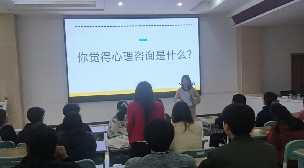 培训中,通过互动提问“什么是心理咨询?”“你愿意在学校做心理咨询吗?”,引导大家深化对心理咨询的理解。