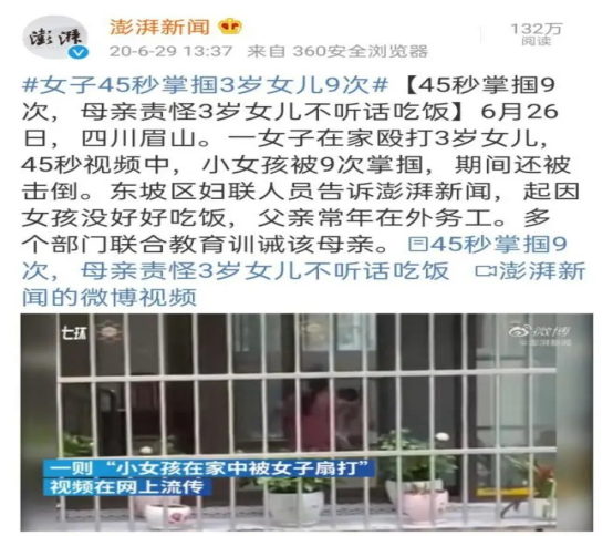 之前看过一则新闻,四川眉山一位妈妈,因责怪女儿不好好吃饭,45秒内掌掴3岁女儿9次。