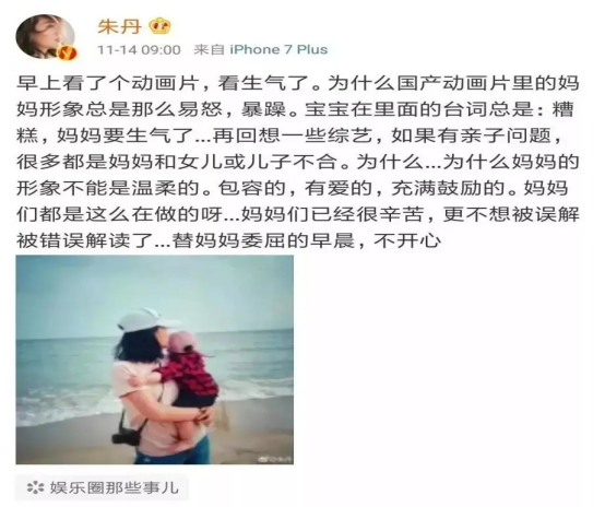 记得有一次朱丹在微博上发飙,起因是动画片描述的妈妈形象让她生气。