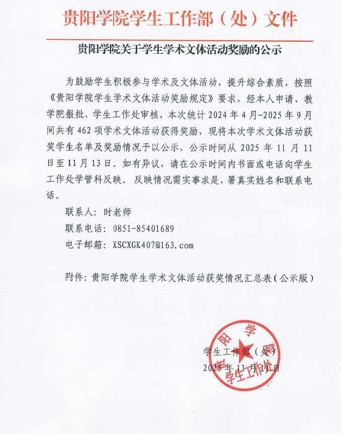 贵阳学院关于学生学术文体活动奖励的公示