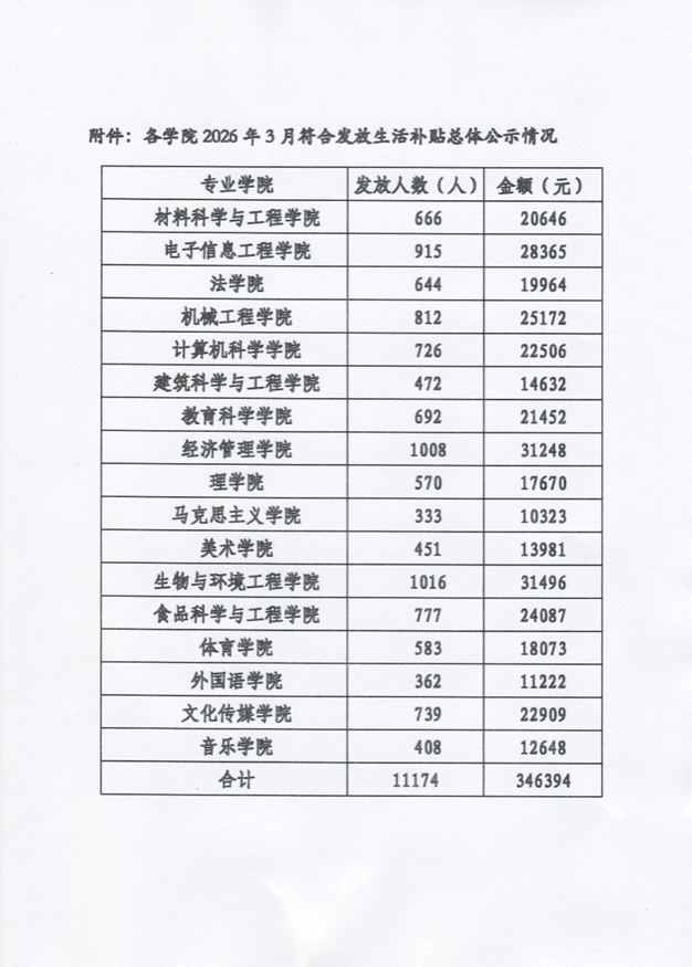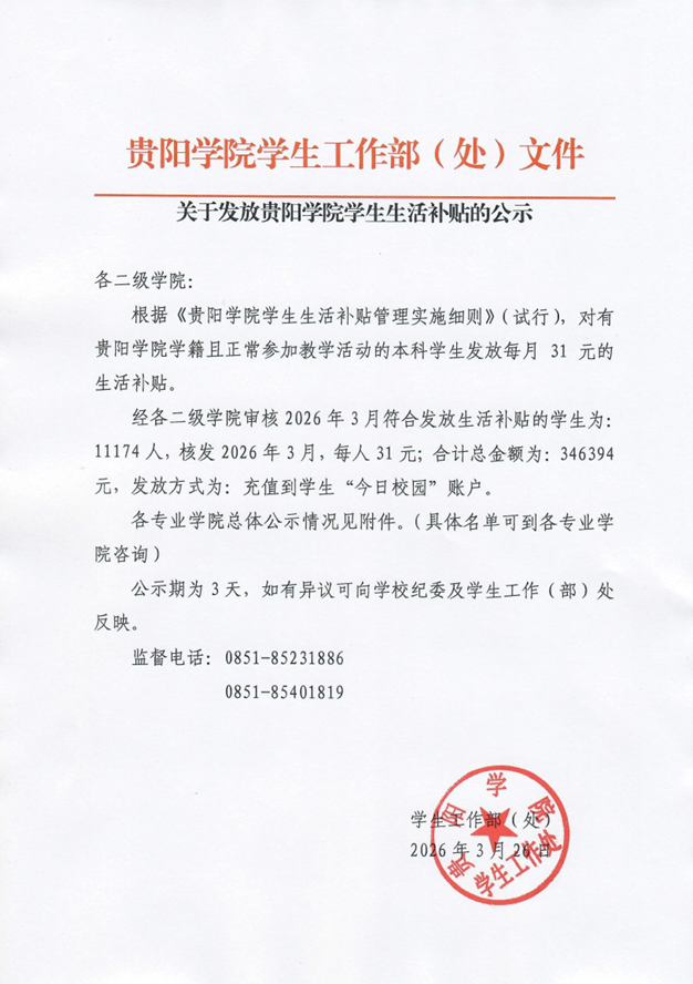 关于发放贵阳学院学生生活补贴的公示