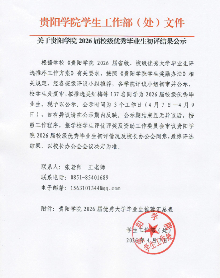 关于贵阳学院2026届校级优秀毕业生初评结果公示